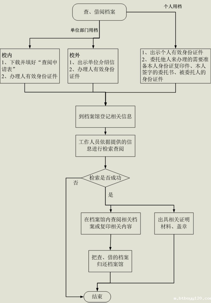 2、到档案馆后到相应档案科室进行查借阅登记,然后档案馆根据提供的相应信息检索查阅,如果有此档案则办理后续流程,否则查阅流程结束;